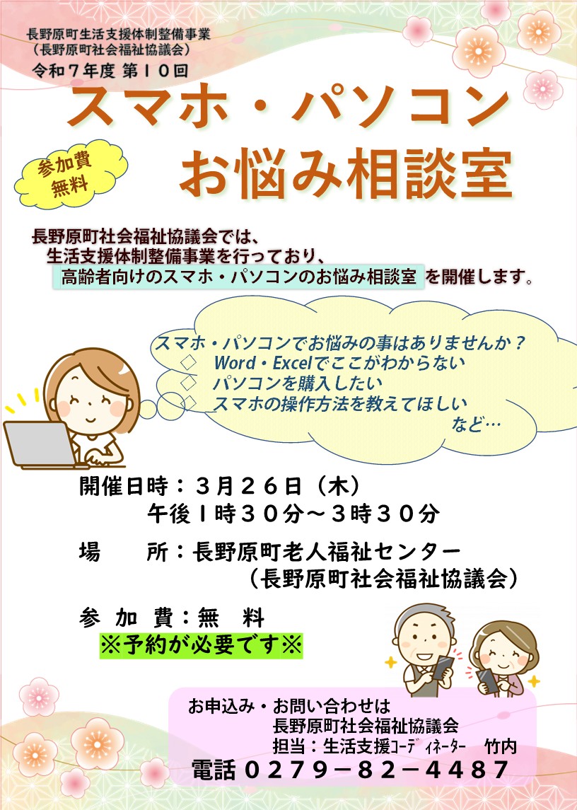 スマホ・パソコン相談室(R7年度10回 3月26日開催) ⾧野原町社会福祉協議会では、生活支援体制整備事業を行って おり、高齢者向けのスマホ・パソコンのお悩み相談室を開催します。 admin 2026-03-12T11:13:02+09:00 2026年3月12日(木曜日)|その他のお知らせ, 新着情報|